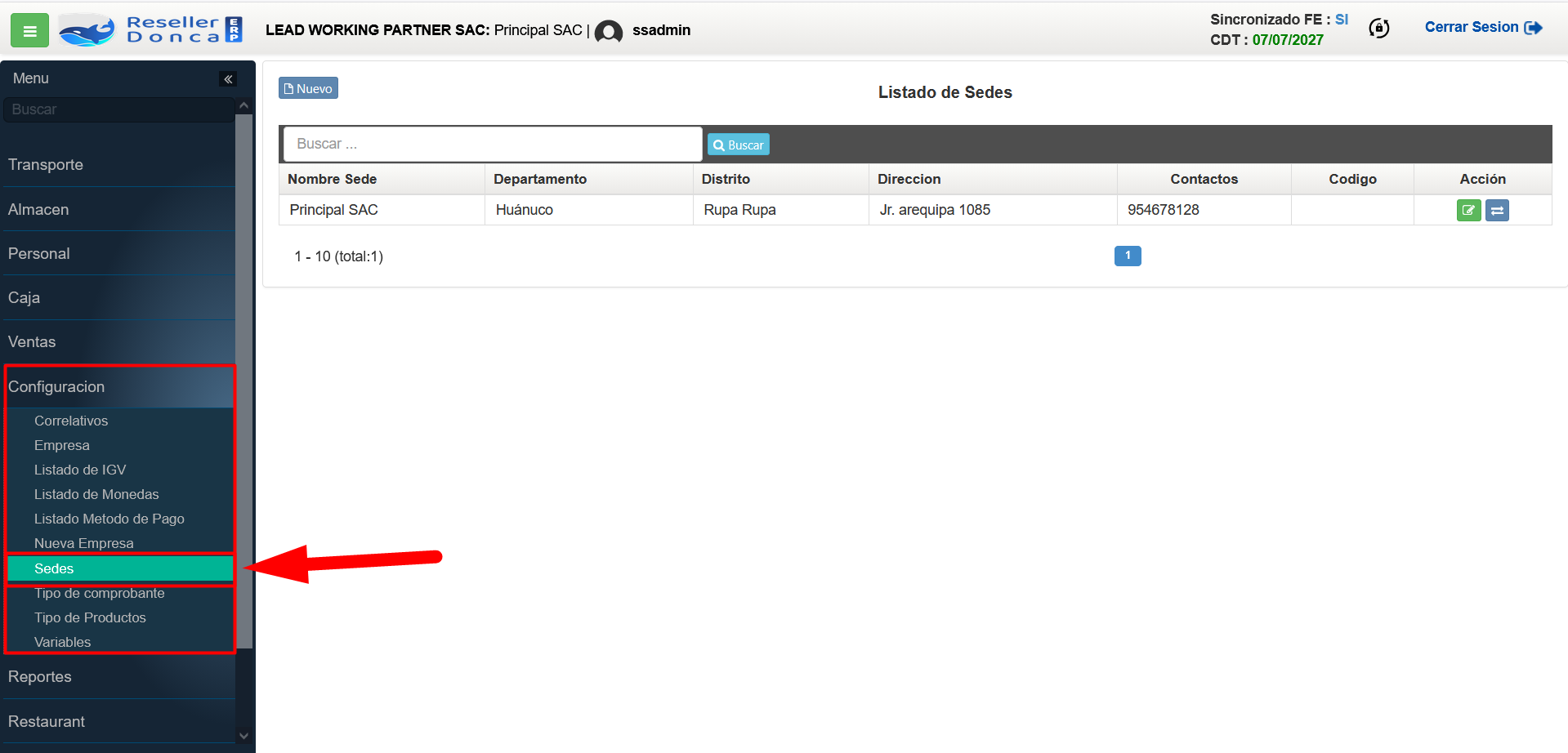 - PASO 1: Ingresar al m贸dulo de "Configuracion" y a la vista de "Sedes".