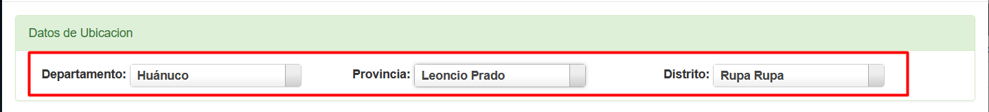 - PASO 3: Seleccionar el Departamento, Provincia y Distrito donde se encuentra ubidado la Nueva Sede creada.