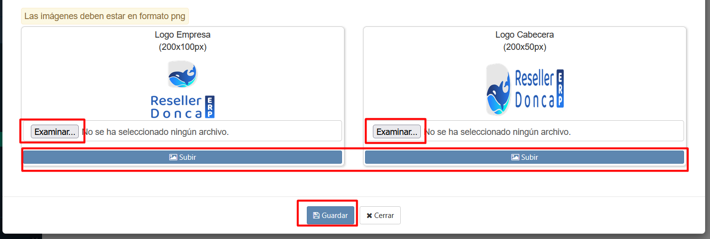 PASO 6: Haz clic en el bot贸n "Examinar", busca y selecciona las im谩genes respectivas para los logos, luego haz clic en el bot贸n "Subir" y luego haz clic en el "Guardar".