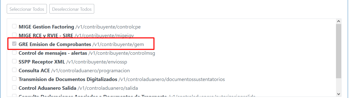 - PASO 10: En Permisos, seleccionar la opci贸n de "GRE Emisi贸n de Comprobantes".