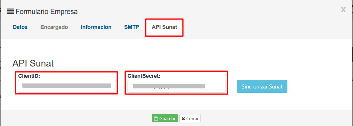 - PASO 14: Haz clic en la pesta帽a de "API SUNAT" y registrar el Client ID y el Client Secret, que se gener贸 en el portal SUNAT del cliente.