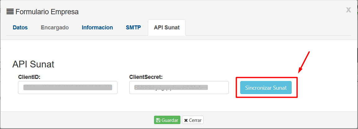 - PASO 15: Haz clic en el bot贸n "Sincronizar SUNAT" para vincular con el portal SUNAT del cliente.