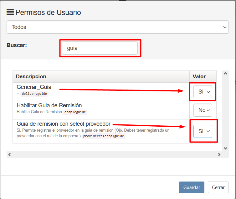 - PASO 3: En el campo de b煤squeda escribir "guia", y en las variables Generar_Guia y la variable Guia de remision con select proveedor cambiar su valor a "Si" y haz clic en el bot贸n "Guardar".