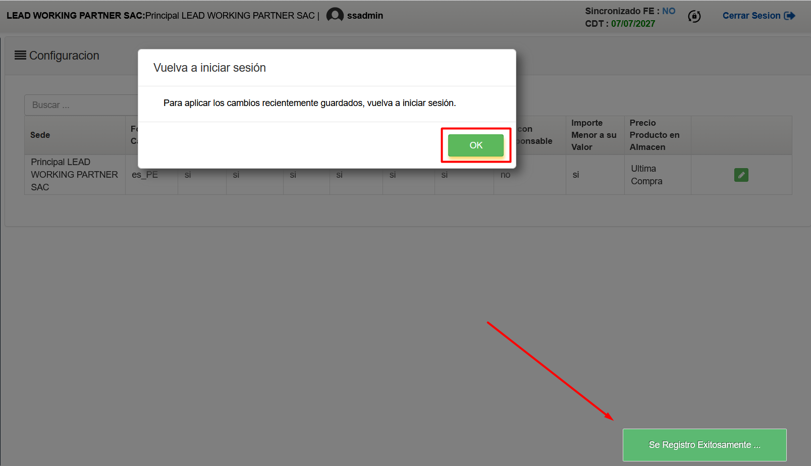 - PASO 4: El sistema mostrar谩 un mensaje de confirmaci贸n, y tambi茅n mostrar谩 una ventana de notificaci贸n avisando que para aplicar los cambios en las variables, se tiene que volver a iniciar sesi贸n en el sistema, haz clic en "OK" para continuar.