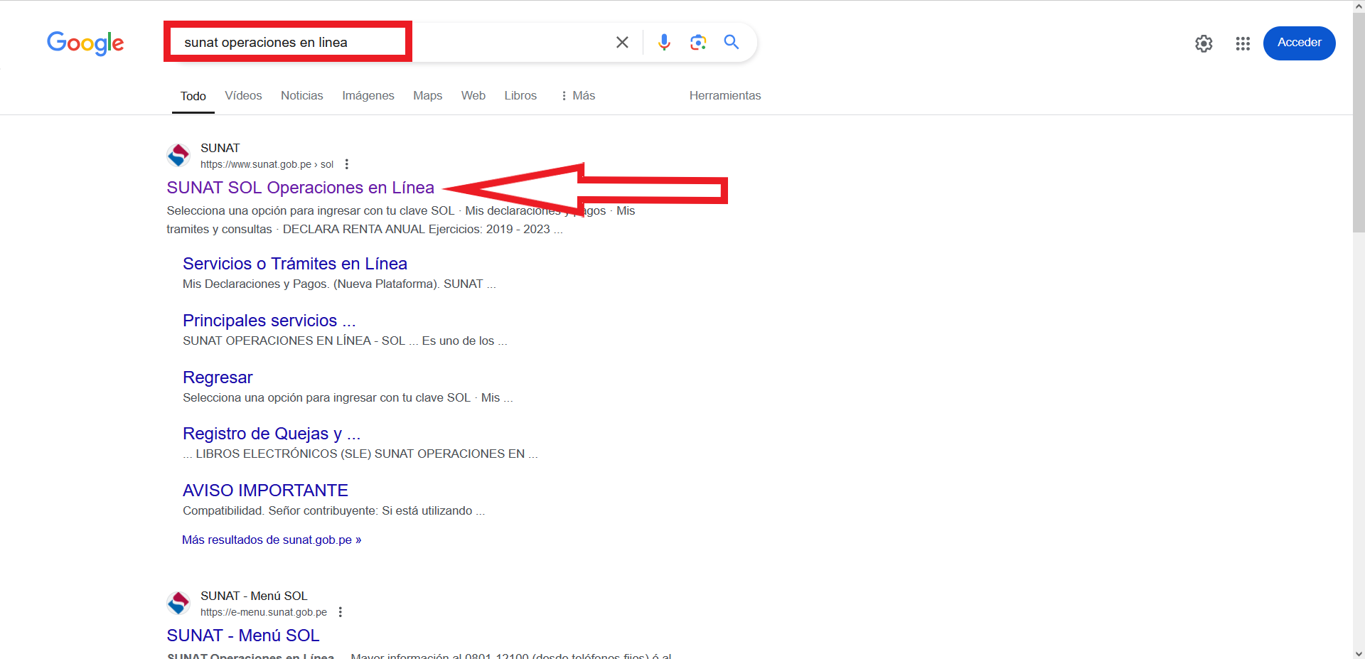 - PASO 5: Luego buscar en el navegador "SUNAT OPERACIONES EN LINEA" e ingresar en ese enlace.