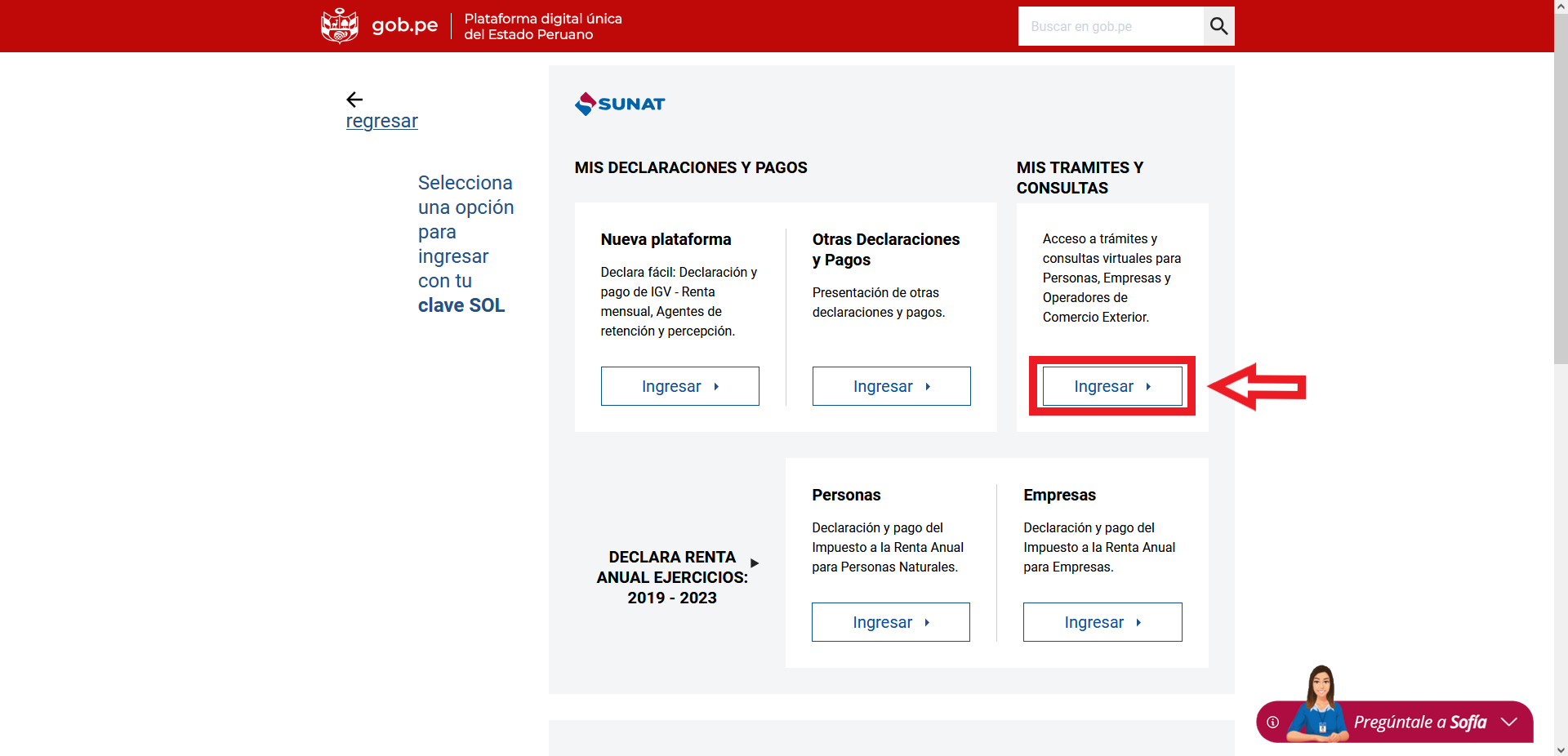 - PASO 6: Haz clic en "Ingresar" en MIS TRAMITES Y CONSULTAS.