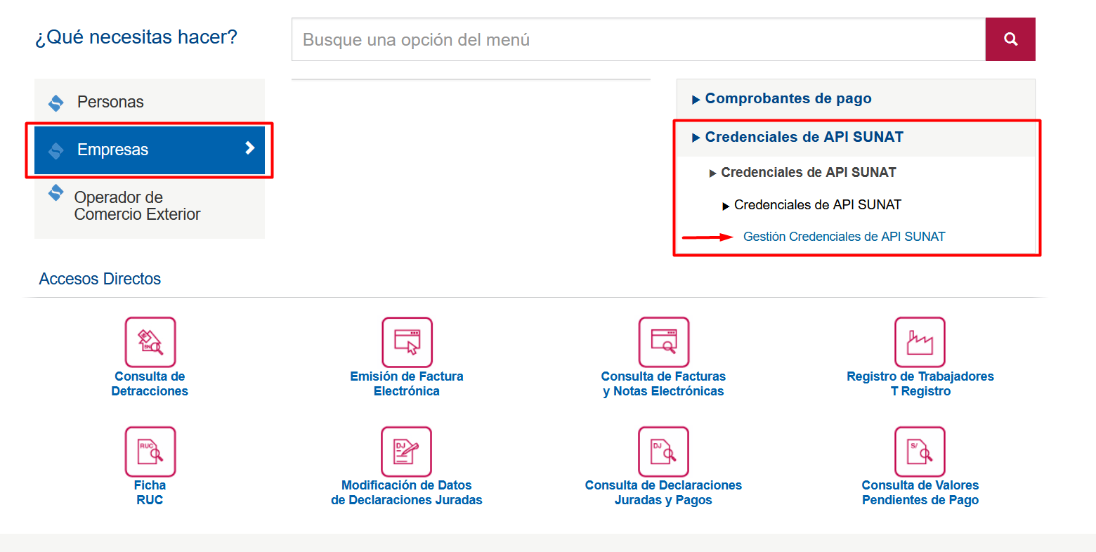 - PASO 8: Dentro del portal de SUNAT del usuario SOL secundario, seleccionar la opci贸n Empresas, luego haz clic en Credenciales de API SUNAT > Credenciales de API SUNAT > Credenciales de API SUNAT y por 煤ltimo haz clic en Gesti贸n Credenciales de API SUNAT.