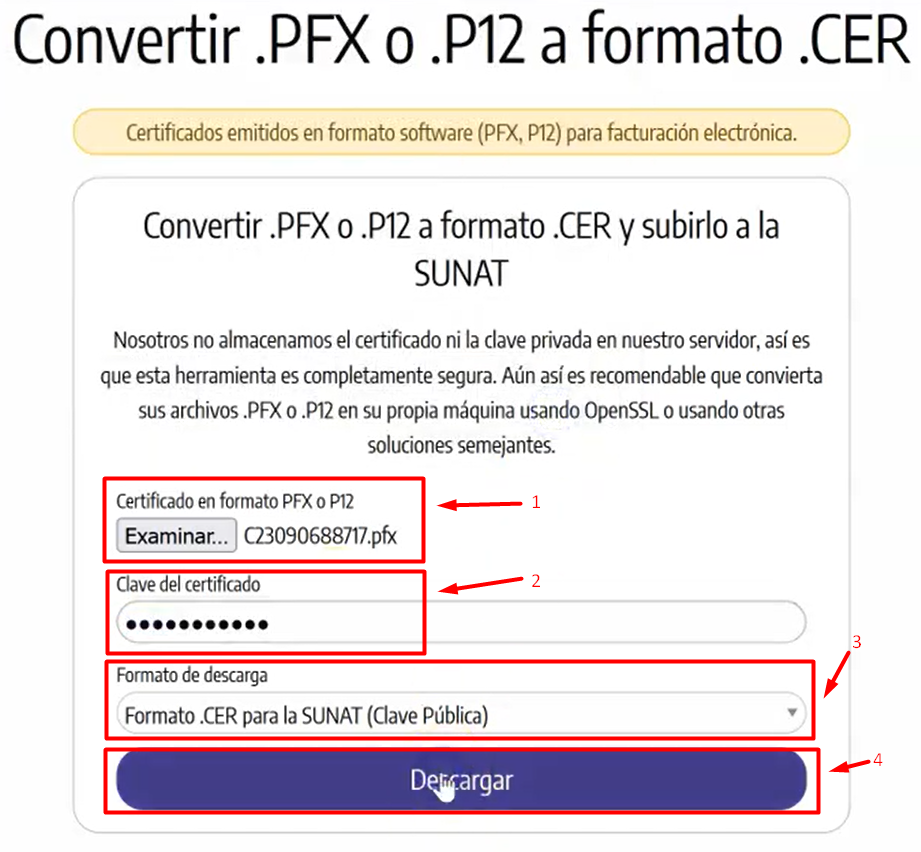 - PASO 1: Necesitamos el CDT o clave p煤blica en formato .CER. Si tenemos el CDT en formato .PFX o .P12 podemos usar la siguiente herramienta para convertirlo al formato que SUNAT exige.