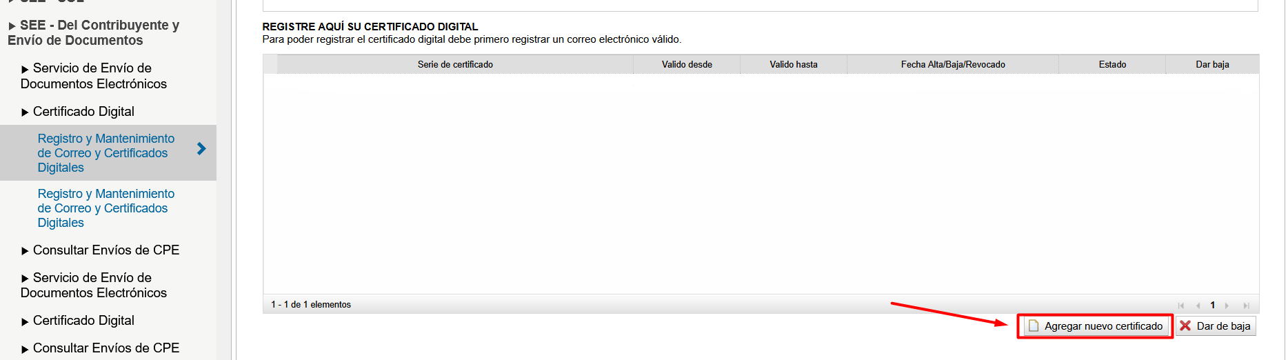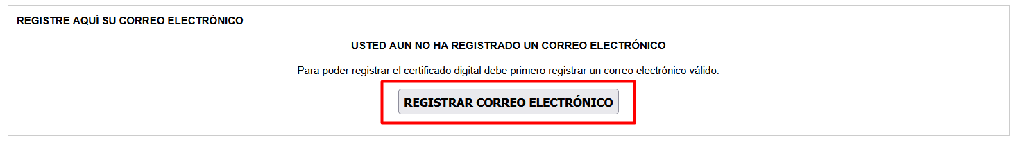 - PASO 8: Haz clic en REGISTRAR CORREO ELECTR脫NICO para habilitar los botones de Agregar nuevo certificado y Dar de baja.