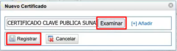 - PASO 15: Haz clic en el bot贸n Examinar, busca y selecciona el CDT en formato .CER, y luego haz clic en el bot贸n Registrar.