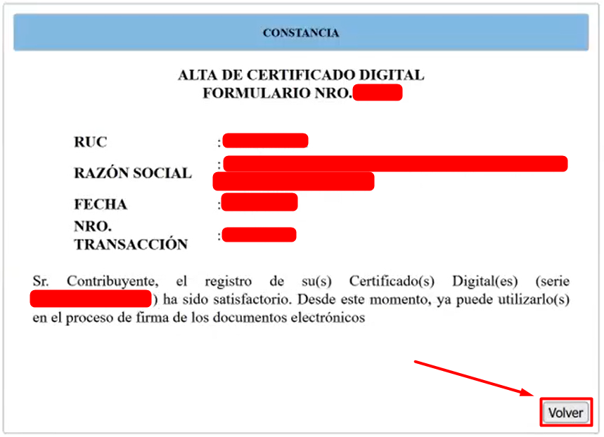 - PASO 16: El sistema mostrar谩 una constancia de Alta de Certificado Digital, haz clic en el bot贸n Volver.