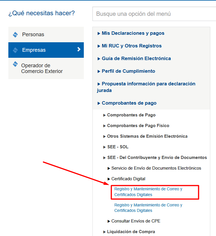 - PASO 6: Seleccionar la opci贸n Empresas, luego ingresar en Comprobantes de Pago > SEE - Del Contribuyente y Env铆o de Documentos > Certificado Digital y por 煤ltimo haz clic en la opci贸n Registro y Mantenimiento de Correo y Certificados Digitales.