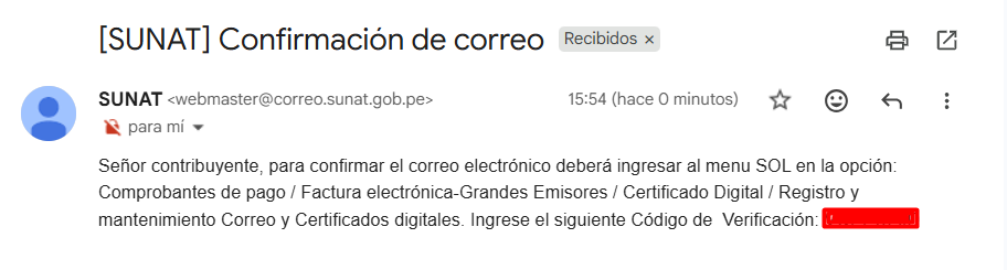 - PASO 11: En la bandeja de entrada del correo electr贸nico llegar谩 un correo con el c贸digo de verificaci贸n.