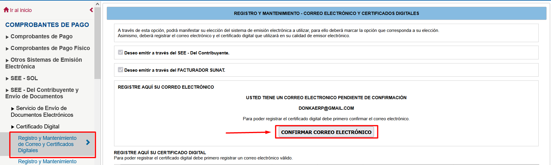- PASO 12: Volver a ingresar en Comprobantes de Pago > SEE - Del Contribuyente y Env铆o de Documentos > Certificado Digital > Registro y Mantenimiento de Correo y Certificados Digitales y por 煤ltimo haz clic en el bot贸n CONFIRMAR CORREO ELECTR脫NICO.