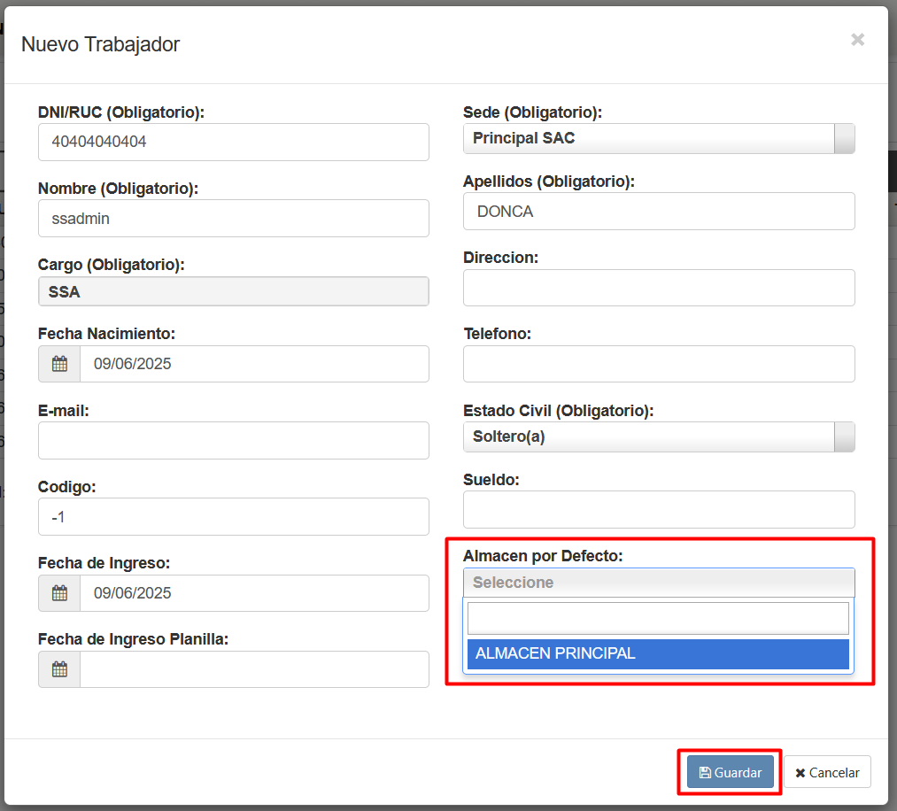 - PASO 14: Asignar Usuarios (Ingresamos al módulo de Personal > Trabajadores, editamos su información para asignarles un almacén por defecto).