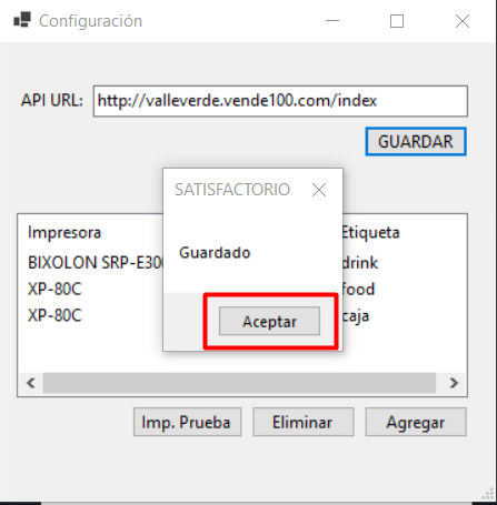 En la ventana de configuración, localiza el campo "API URL". Ingresa la URL del sistema de tu cliente, luego hacemos clic en el botón "Guardar" para aplicar los cambios. Haz clic en "Aceptar" para cerrar la ventana de configuración.