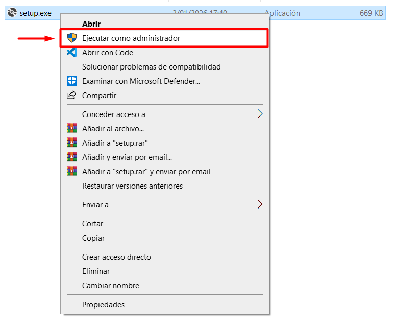 Localiza el archivo setup.exe descargado en tu carpeta de descargas. Haz clic derecho sobre el archivo y selecciona "Ejecutar como administrador". Aparecerá una ventana de Control de cuentas de usuario. Haz clic en "Sí" para autorizar la instalación.