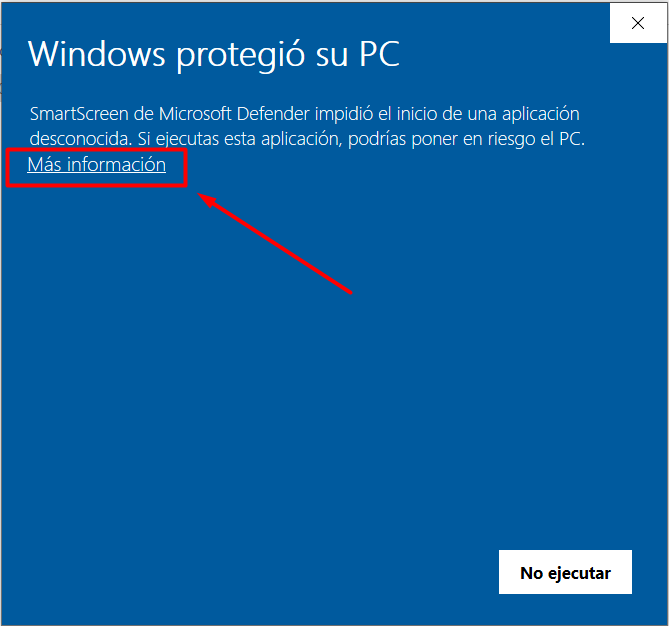 Microsoft Defender SmartScreen mostrará una advertencia de seguridad. Haz clic en "Más información".
