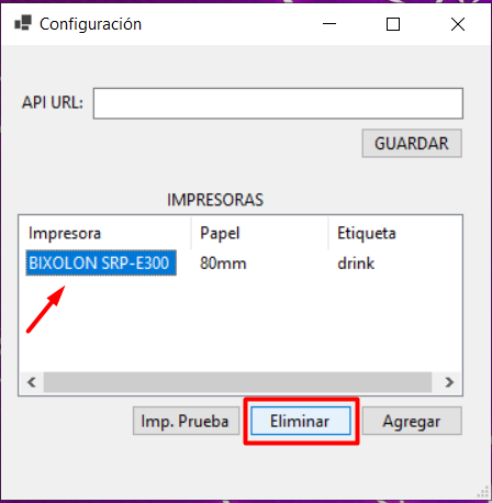 Verifica la lista de Impresoras en la ventana de configuraci贸n. Si existe alguna impresora previamente configurada, selecciona la impresora, haz clic en el bot贸n "Eliminar", repite el proceso hasta que la lista quede vac铆a.