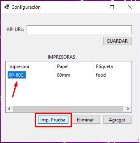 Para verificar la configuraci贸n, selecciona la impresora reci茅n agregada de la lista, haz clic en el bot贸n "Imp. Prueba" (Impresi贸n de Prueba).